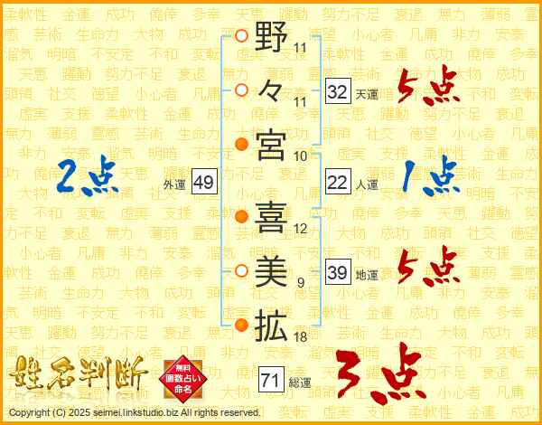 野(11画)々(11画)宮(10画) 喜(12画)美(9画)拡(18画)