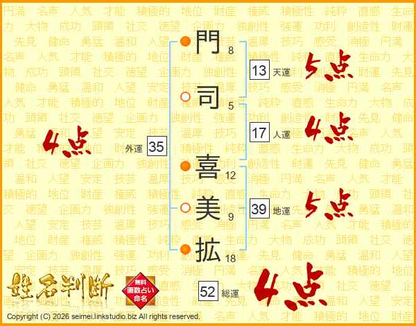 門(8画)司(5画) 喜(12画)美(9画)拡(18画)