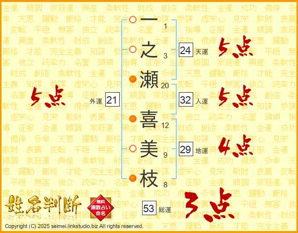 一(1画)之(3画)瀬(20画) 喜(12画)美(9画)枝(8画)