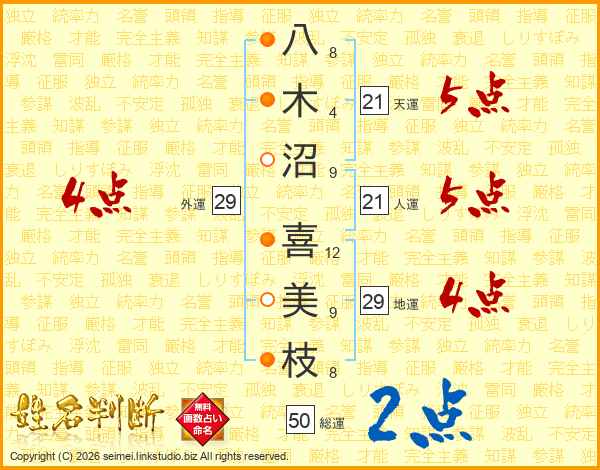 八(8画)木(4画)沼(9画) 喜(12画)美(9画)枝(8画)