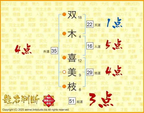 双(18画)木(4画) 喜(12画)美(9画)枝(8画)