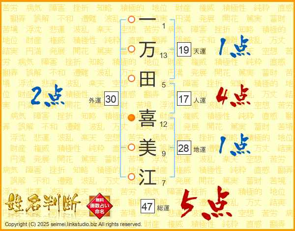 一(1画)万(13画)田(5画) 喜(12画)美(9画)江(7画)