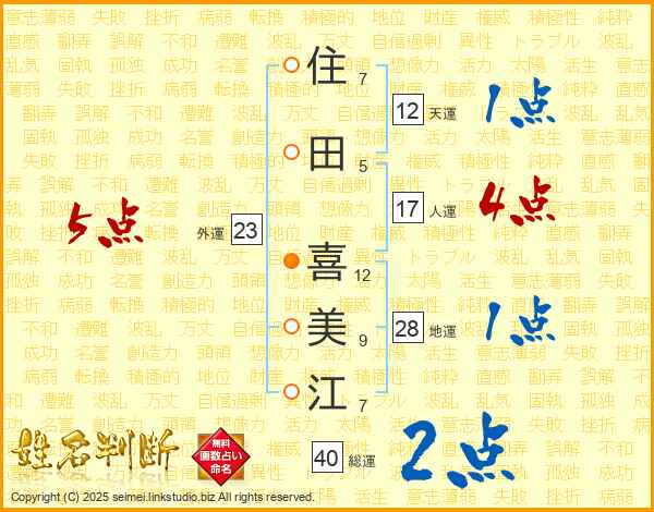 住(7画)田(5画) 喜(12画)美(9画)江(7画)