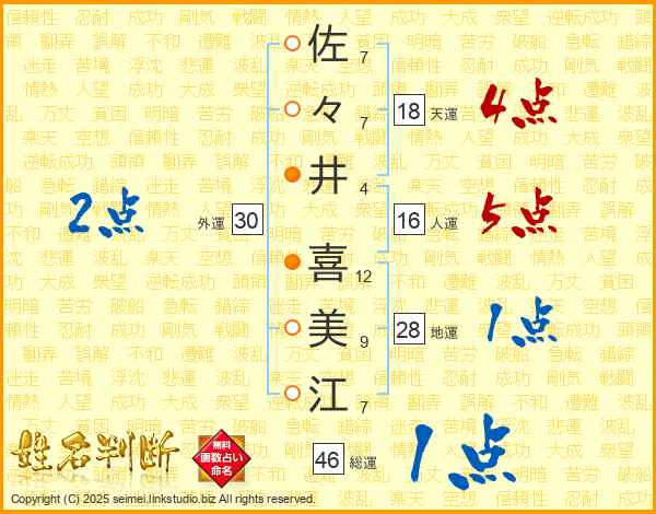佐(7画)々(7画)井(4画) 喜(12画)美(9画)江(7画)