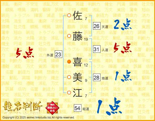佐(7画)藤(19画) 喜(12画)美(9画)江(7画)