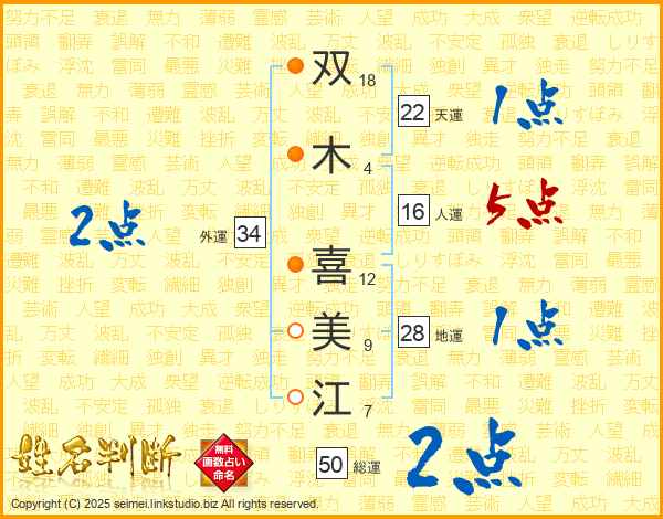 双(18画)木(4画) 喜(12画)美(9画)江(7画)