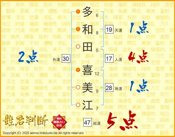 多(6画)和(8画)田(5画) 喜(12画)美(9画)江(7画)