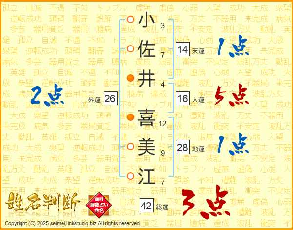 小(3画)佐(7画)井(4画) 喜(12画)美(9画)江(7画)