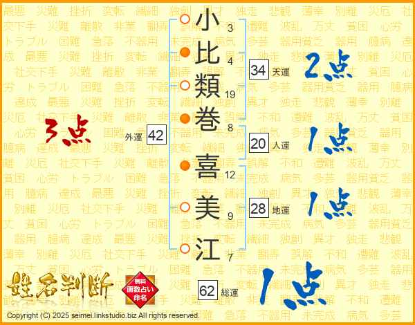 小(3画)比(4画)類(19画)巻(8画) 喜(12画)美(9画)江(7画)