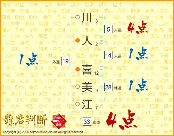 川(3画)人(2画) 喜(12画)美(9画)江(7画)