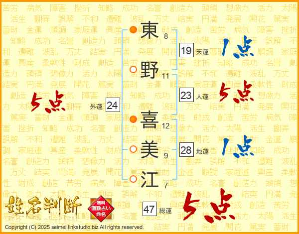 東(8画)野(11画) 喜(12画)美(9画)江(7画)