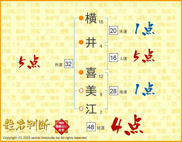 横(16画)井(4画) 喜(12画)美(9画)江(7画)