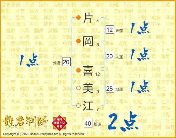 片(4画)岡(8画) 喜(12画)美(9画)江(7画)