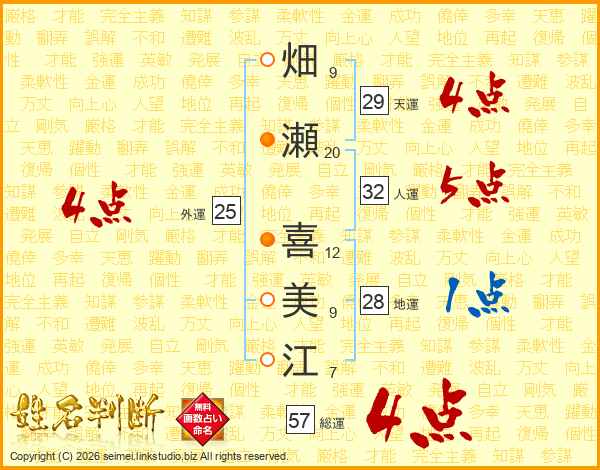 畑(9画)瀬(20画) 喜(12画)美(9画)江(7画)