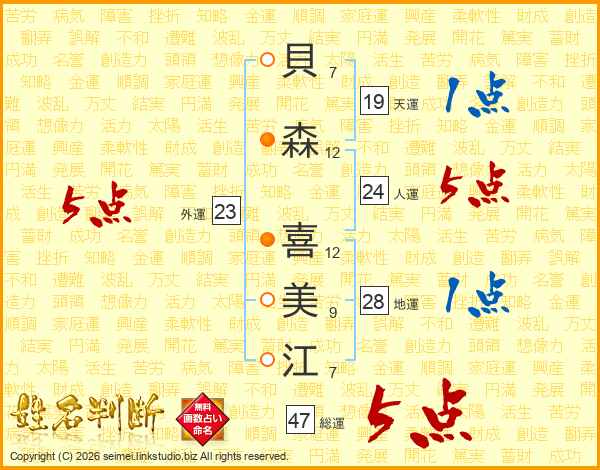 貝(7画)森(12画) 喜(12画)美(9画)江(7画)