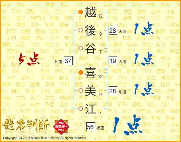 越(12画)後(9画)谷(7画) 喜(12画)美(9画)江(7画)