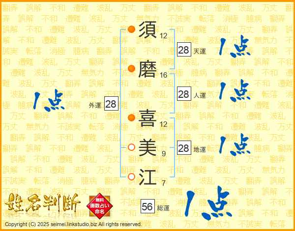 須(12画)磨(16画) 喜(12画)美(9画)江(7画)