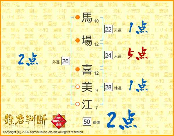 馬(10画)場(12画) 喜(12画)美(9画)江(7画)