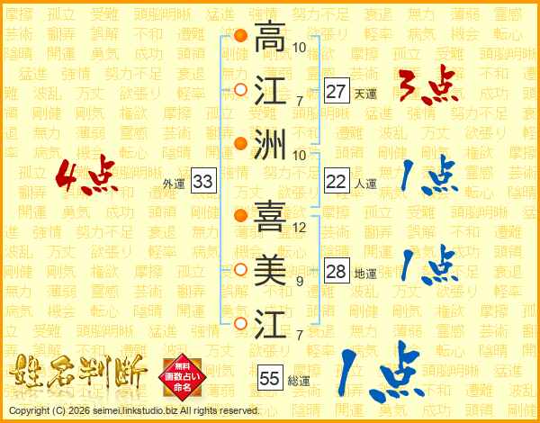高(10画)江(7画)洲(10画) 喜(12画)美(9画)江(7画)