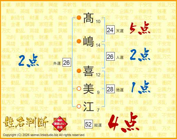髙(10画)嶋(14画) 喜(12画)美(9画)江(7画)