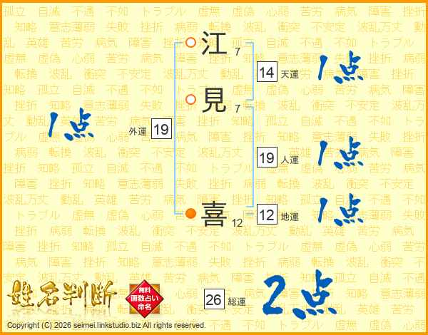 画数の奇数(○陽)と偶数(●陰)の配列で吉凶を占います。どちらかにかたよる名前は大凶名で避ける必要があります。画数の奇数偶数。