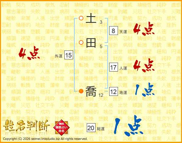 生活面を象徴する運勢です。外部から受ける影響力を表し、結婚運、家庭運や職場、環境への順応性を表します。総運から人運を引いた画数。姓や名が1文字の場合を除く。
