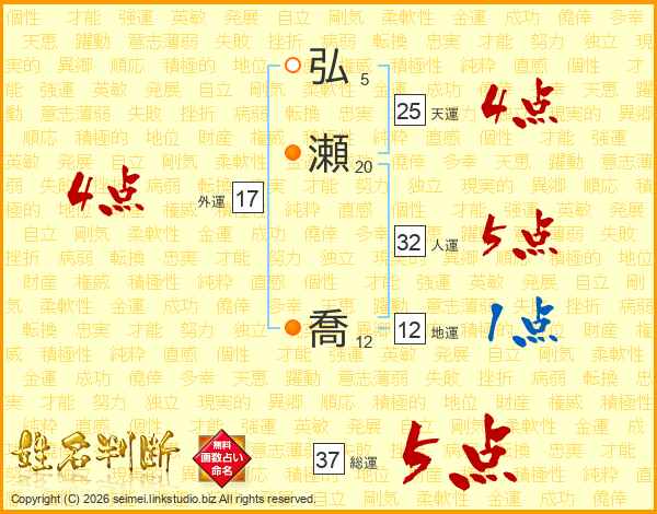 弘瀬喬さんの総運は37画の5点!