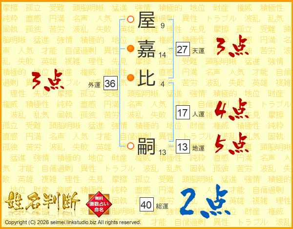 屋(9画)嘉(14画)比(4画) 嗣(13画)