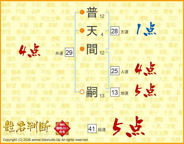 あなたの人生を表す1番重要な運勢です。生涯を通じて影響する総合運となり、主に50歳以降の晩年期に影響を及ぼします。苗字と名前の合計画数。