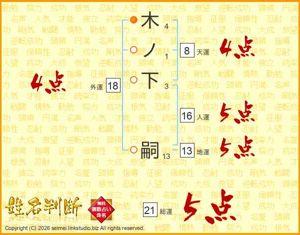 生活面を象徴する運勢です。外部から受ける影響力を表し、結婚運、家庭運や職場、環境への順応性を表します。総運から人運を引いた画数。姓や名が1文字の場合を除く。
