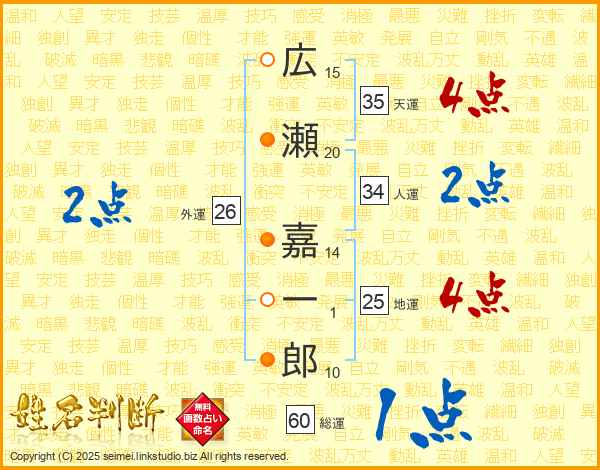 広瀬嘉一郎さんの地運は25画の4点!