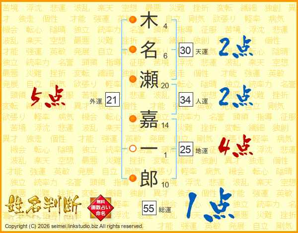 木(4画)名(6画)瀬(20画) 嘉(14画)一(1画)郎(10画)
