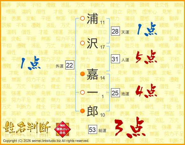 浦(11画)沢(17画) 嘉(14画)一(1画)郎(10画)