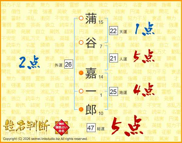 蒲(15画)谷(7画) 嘉(14画)一(1画)郎(10画)