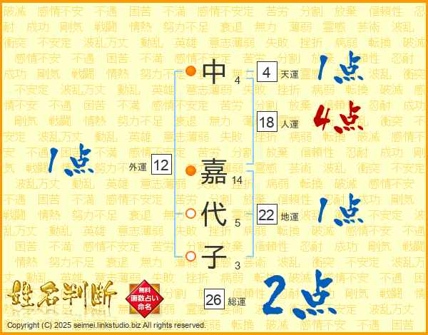 生活面を象徴する運勢です。外部から受ける影響力を表し、結婚運、家庭運や職場、環境への順応性を表します。総運から人運を引いた画数。姓や名が1文字の場合を除く。