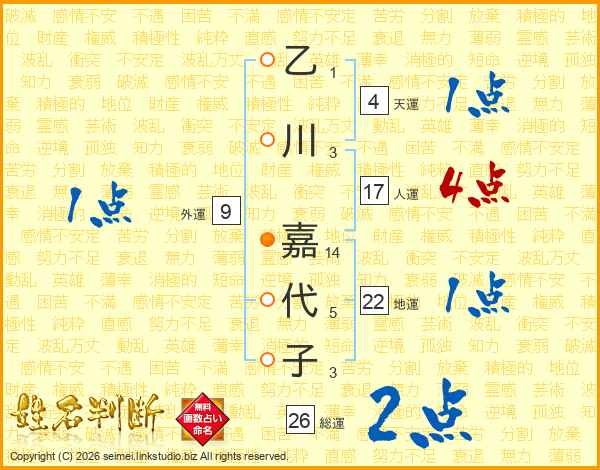 乙(1画)川(3画) 嘉(14画)代(5画)子(3画)