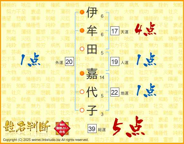 伊(6画)牟(6画)田(5画) 嘉(14画)代(5画)子(3画)