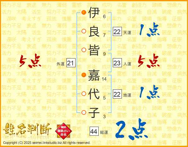伊(6画)良(7画)皆(9画) 嘉(14画)代(5画)子(3画)