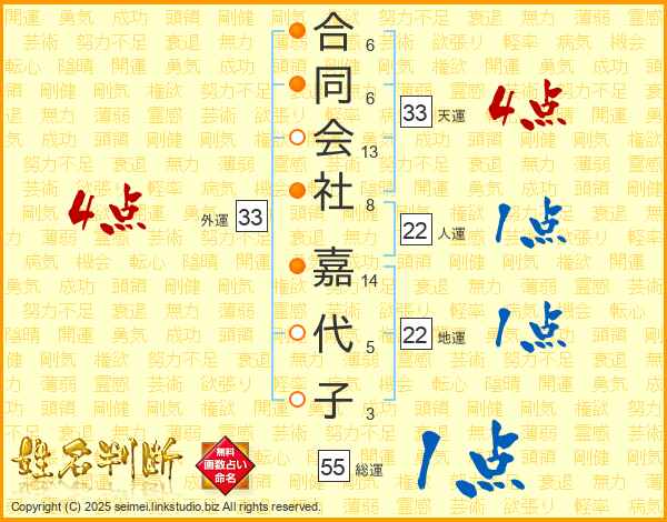 合(6画)同(6画)会(13画)社(8画) 嘉(14画)代(5画)子(3画)