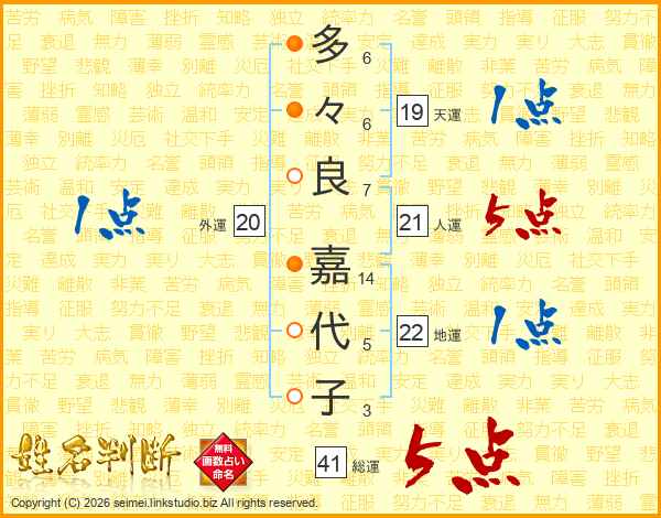 多(6画)々(6画)良(7画) 嘉(14画)代(5画)子(3画)