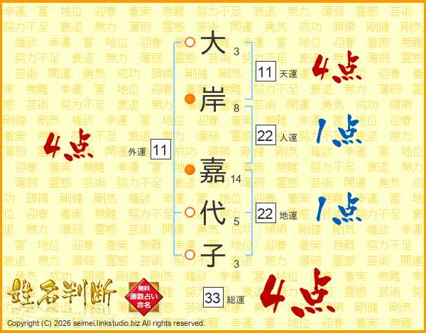 大(3画)岸(8画) 嘉(14画)代(5画)子(3画)