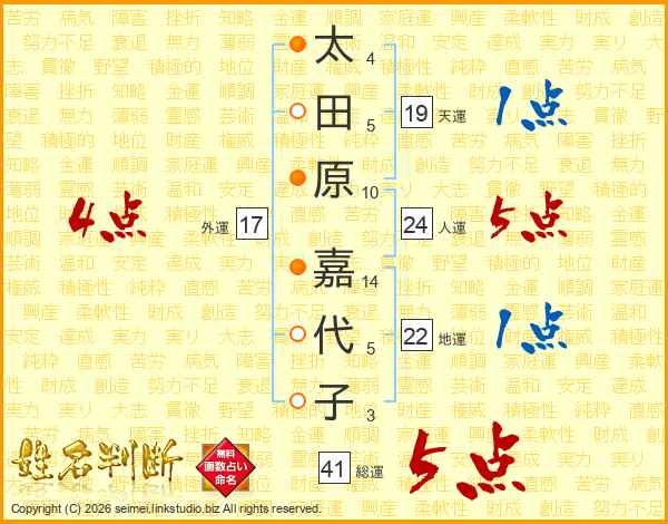 太(4画)田(5画)原(10画) 嘉(14画)代(5画)子(3画)