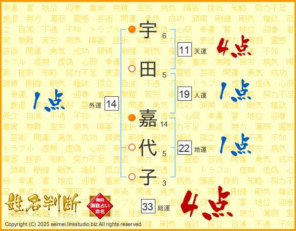 宇(6画)田(5画) 嘉(14画)代(5画)子(3画)