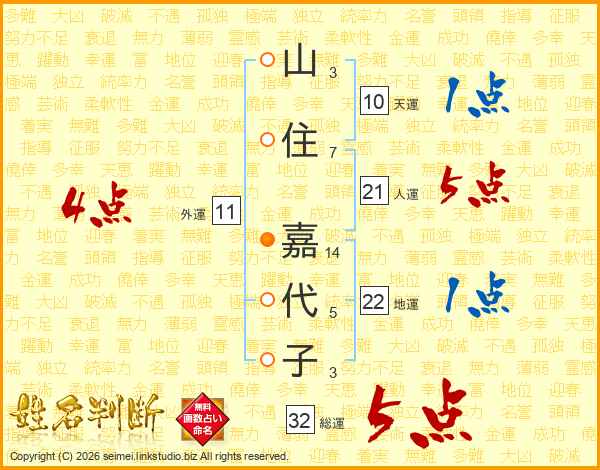 山(3画)住(7画) 嘉(14画)代(5画)子(3画)