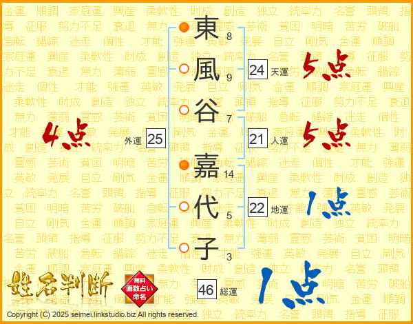 東(8画)風(9画)谷(7画) 嘉(14画)代(5画)子(3画)