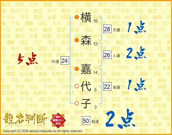 横(16画)森(12画) 嘉(14画)代(5画)子(3画)