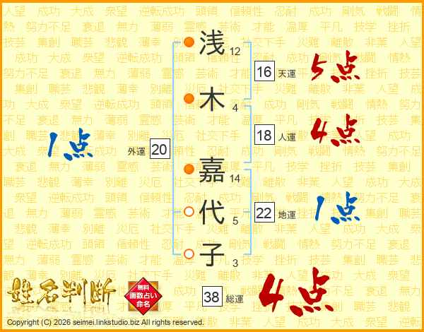 浅(12画)木(4画) 嘉(14画)代(5画)子(3画)