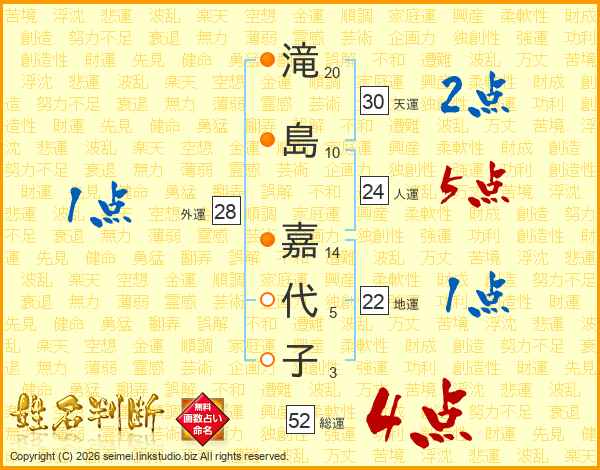 滝(20画)島(10画) 嘉(14画)代(5画)子(3画)