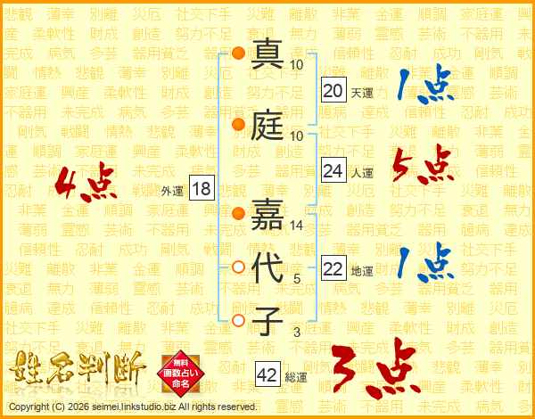 真(10画)庭(10画) 嘉(14画)代(5画)子(3画)