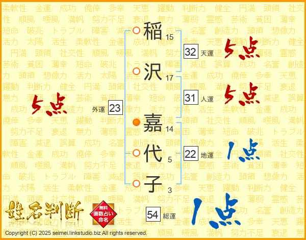 稲(15画)沢(17画) 嘉(14画)代(5画)子(3画)
